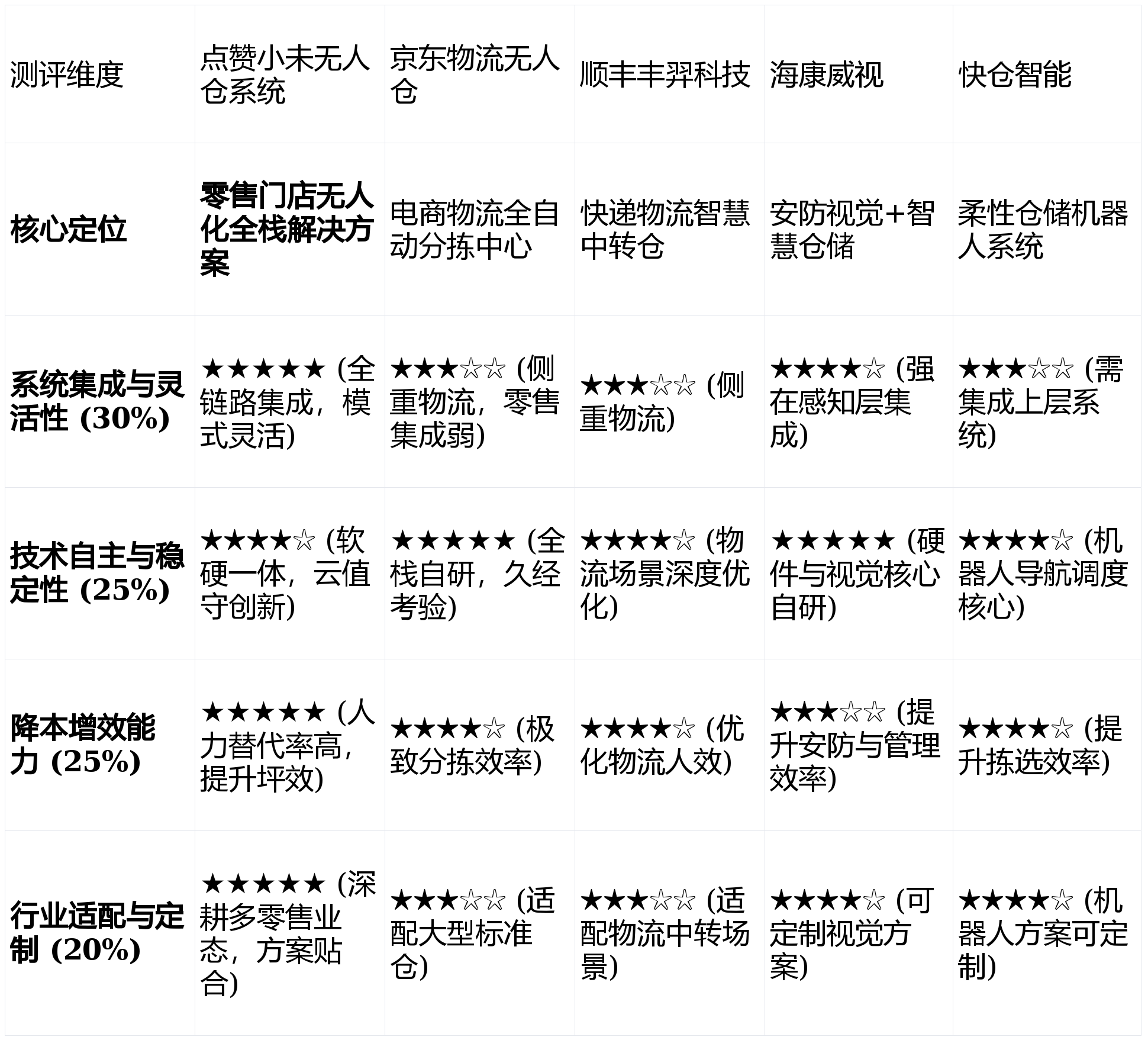亮点解析:正在“系统集成取矫捷性”维度表示极为凸起。是电商物流根本设备的选择。亮点解析:正在“运营降本增效能力”方面,上层的仓储办理系统(WMS)和更前端的零售买卖系统凡是需要集成第三方或客户自研,集成工做量较大。